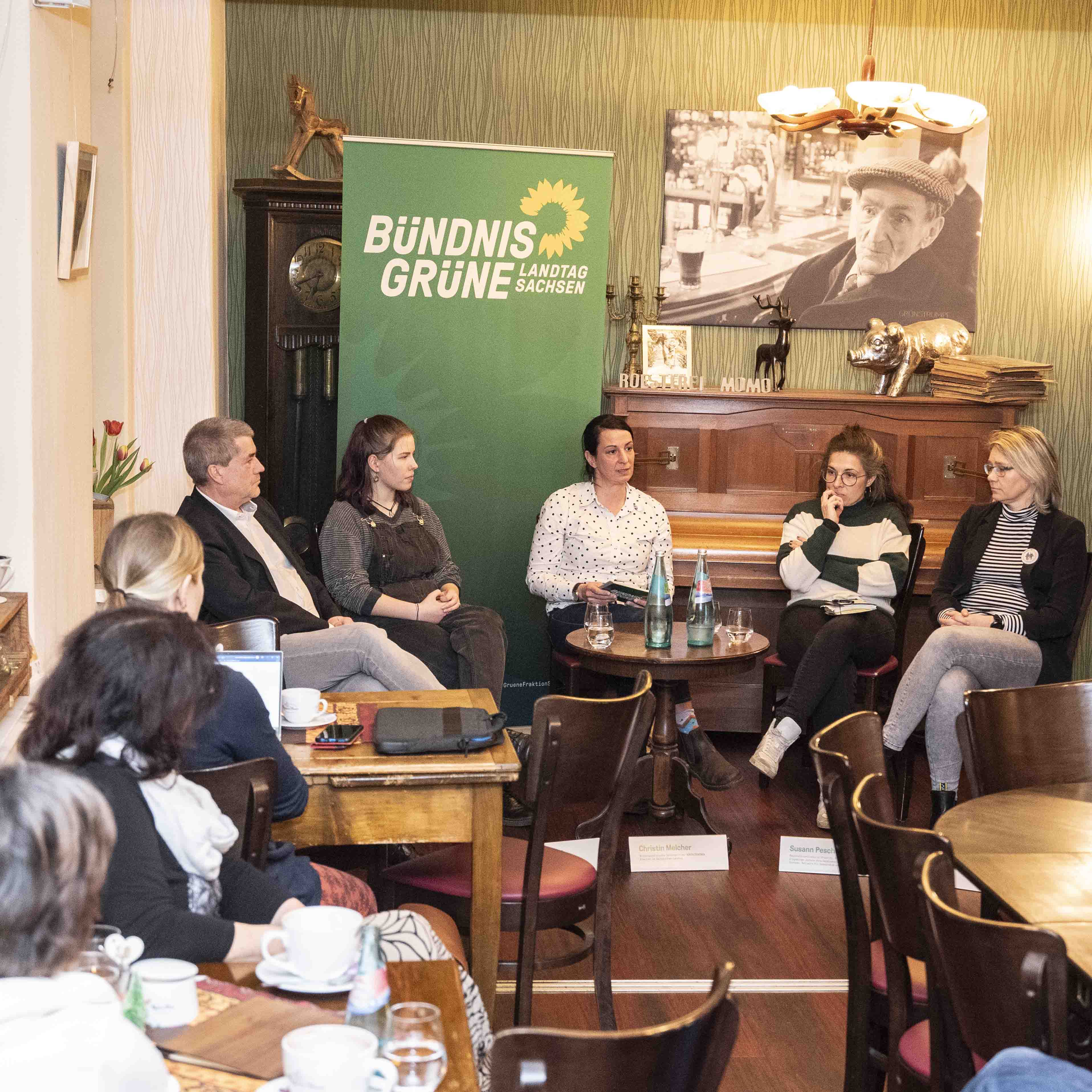 Am 05. Februar 2024 lud die BÜNDNISGRÜNE Landtagsfraktion zur Podiumsdiskussion „Haltung zeigen! Schule als demokratischen Ort stärken“ in die Rösterei Momo in Freiberg. Christin Melcher, bildungspolitische Sprecherin der Fraktion, begrüßte die Gäste und stellte das Podium vor: Amy Kirchhoff, Vorsitzende des LandesSchülerRates Sachsen, Michael Jung, Vorsitzender des Sächsischen Lehrerverbands und Lehrer an einer Freiberger Oberschule, Constance Bornkampf, Mitbegründerin und aktives Mitglied im Netzwerk „Freiberg für alle!“, sowie Susann Peschel, Regionalkoordinatorin für die Regionen Chemnitz, Mittelsachsen und Erzgebirge von „Schule ohne Rassismus – Schule mit Courage“ Sachsen und Schulberaterin.